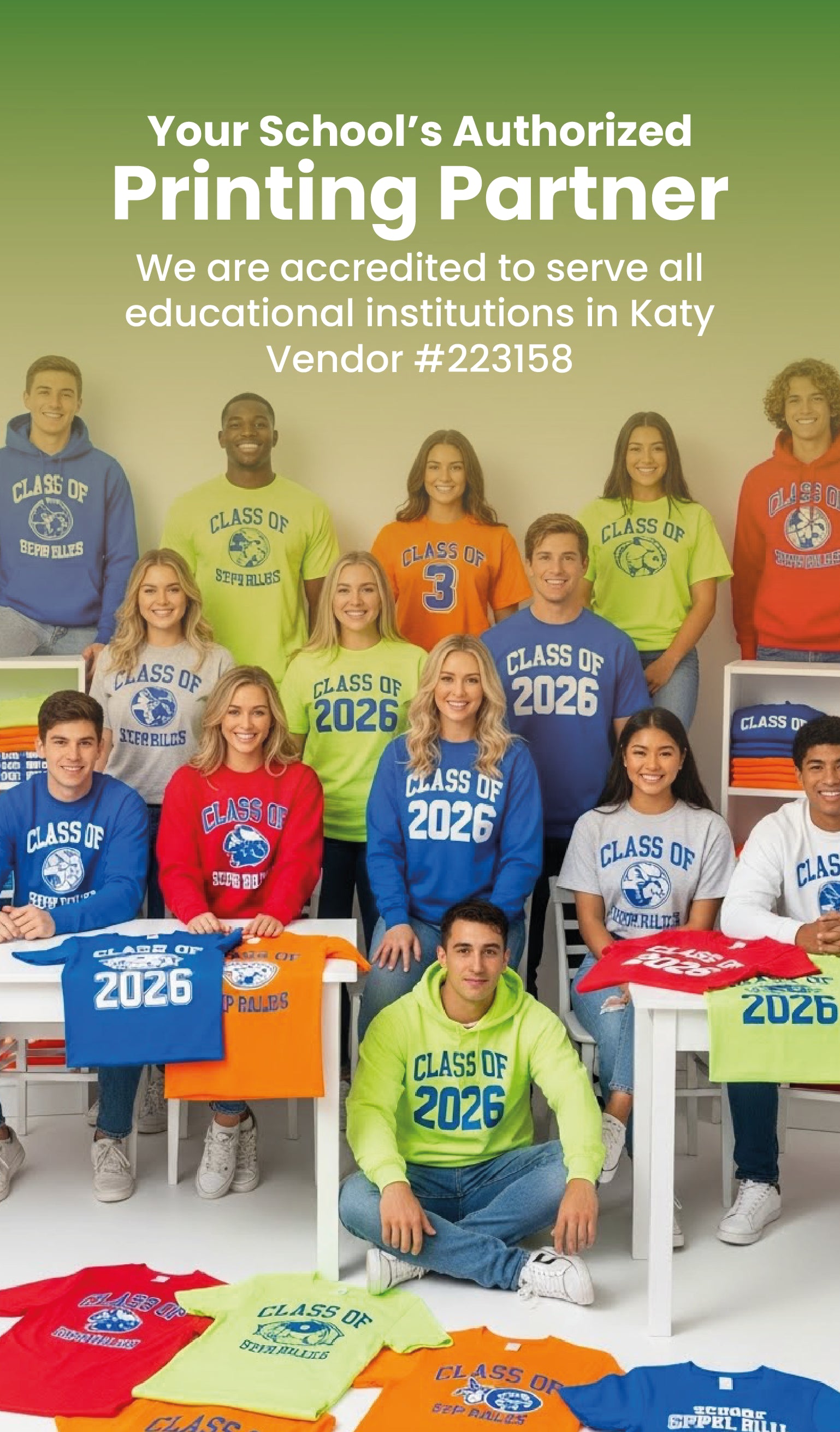 Serving Katy, Houston, Sugar Land, Richmond, Cypress, and surrounding Texas communities with professional custom shirt printing services since [Year].